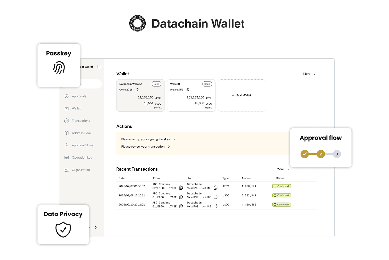 Datachain Wallet is a Web3 wallet powered by “Datachain Privacy.” It is the first enterprise-focused Web3 wallet in the industry (*1) to combine privacy-preserving transactions with Passkey-based key management.